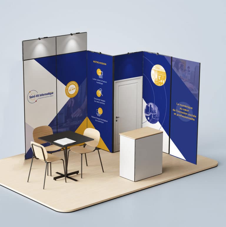 Pour répondre à la demande de Saint-Vite Informatique, nous avons d’abord travaillé sur une direction artistique avant de la déployer à un modèle de stand, une paire de roll up ainsi qu’un flyer. Objectif : créer un univers graphique qui aide à faire connaître et reconnaître l’association.