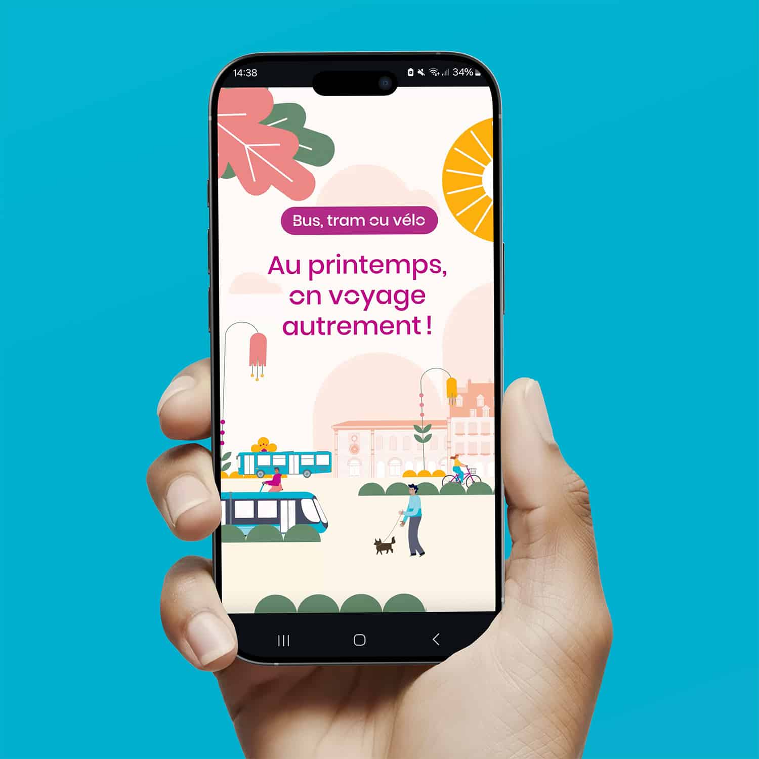 Section Graphik a tout d’abord défini un univers graphique coloré et chaleureux pour marquer l’arrivée du printemps. Concernant la vidéo en motion design, les séquences ont été définies au préalable avec Ginko. Une fois validées, nous avons pu intégrer les éléments de notre illustration de façon à animer les personnages, puis les bus, les tramways et les vélos Ginko.