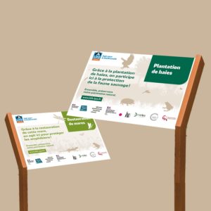 Nous avons ainsi conçu une série de panneaux en lien avec les actions menées par la LPO : plantation de haies, restauration de mare et création d’aménagements favorables à la biodiversité, de manière à ce qu’ils attirent l’œil et interpellent le grand public pour continuer d’éveiller les consciences. Nous qui d’habitude prônons la sobriété, nous aimerions bien voir ces panneaux fleurir un peu partout sur notre territoire !